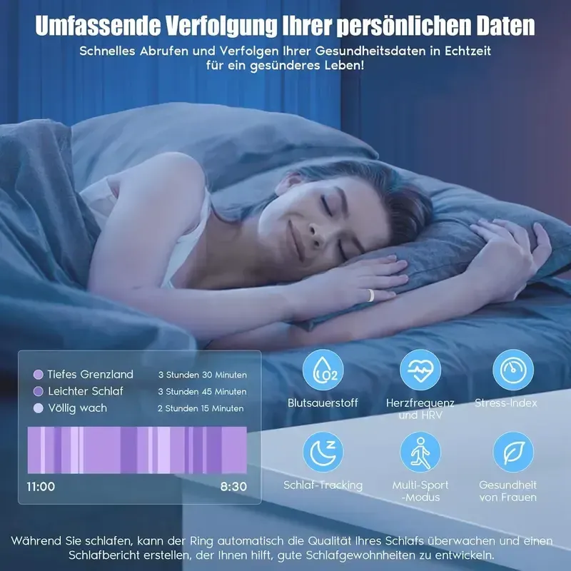 🌟Key Features·Heart Rate: Monitor your heart's activity.·Calories: Track your daily calorie intake.·Sleep: Analyze your sleep patterns.·Menstrual Cycle: Track phases for health insights.·Stress & Emotion: Gauge your stress levels and emotions.·Gesture Control: Use gestures for easy interaction.CompatibilityElevate your health monitoring with the Smart Ring. It combines multiple health metrics into one sleek device. Ideal for anyone looking to enhance their health awareness. Stay informed and active with this innovative accessory. Android & iOS compatible. 📱💻